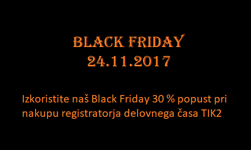 V “Black Friday” tednu do 24.11.2017 vam nudimo 30 % popust pri nakupu registratorja delovnega časa TIK2. Kontaktirajte nas za ugodno ponudbo ali preberite več o registraciji delovnega časa s