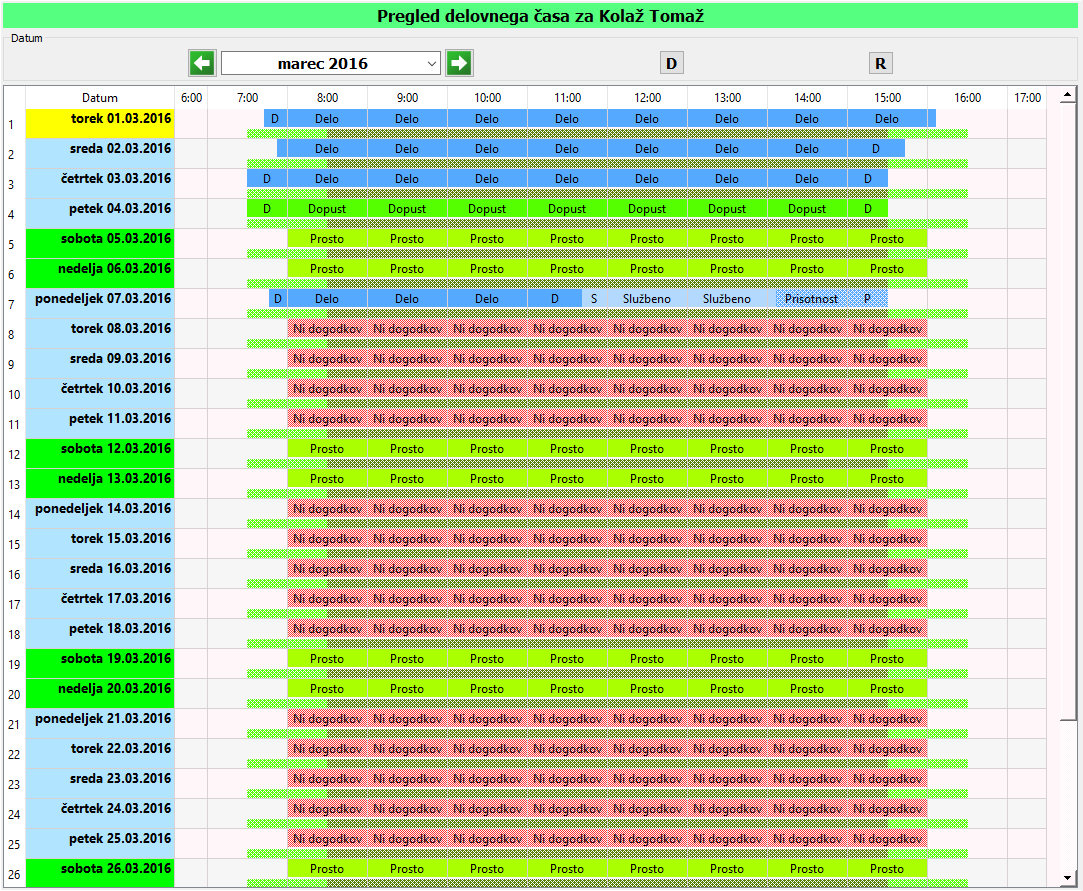 - Pregled delovnega časa po dnevih.